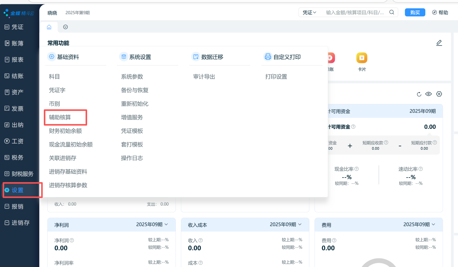 (1)切换至云会计界面,进入【设置】-【辅助核算】页面;