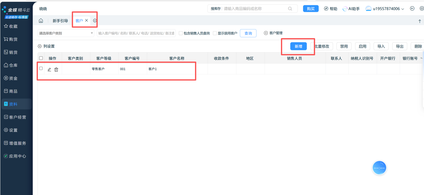 (1)登录金蝶精斗云进销存系统,进入【资料】-【客户】模块;