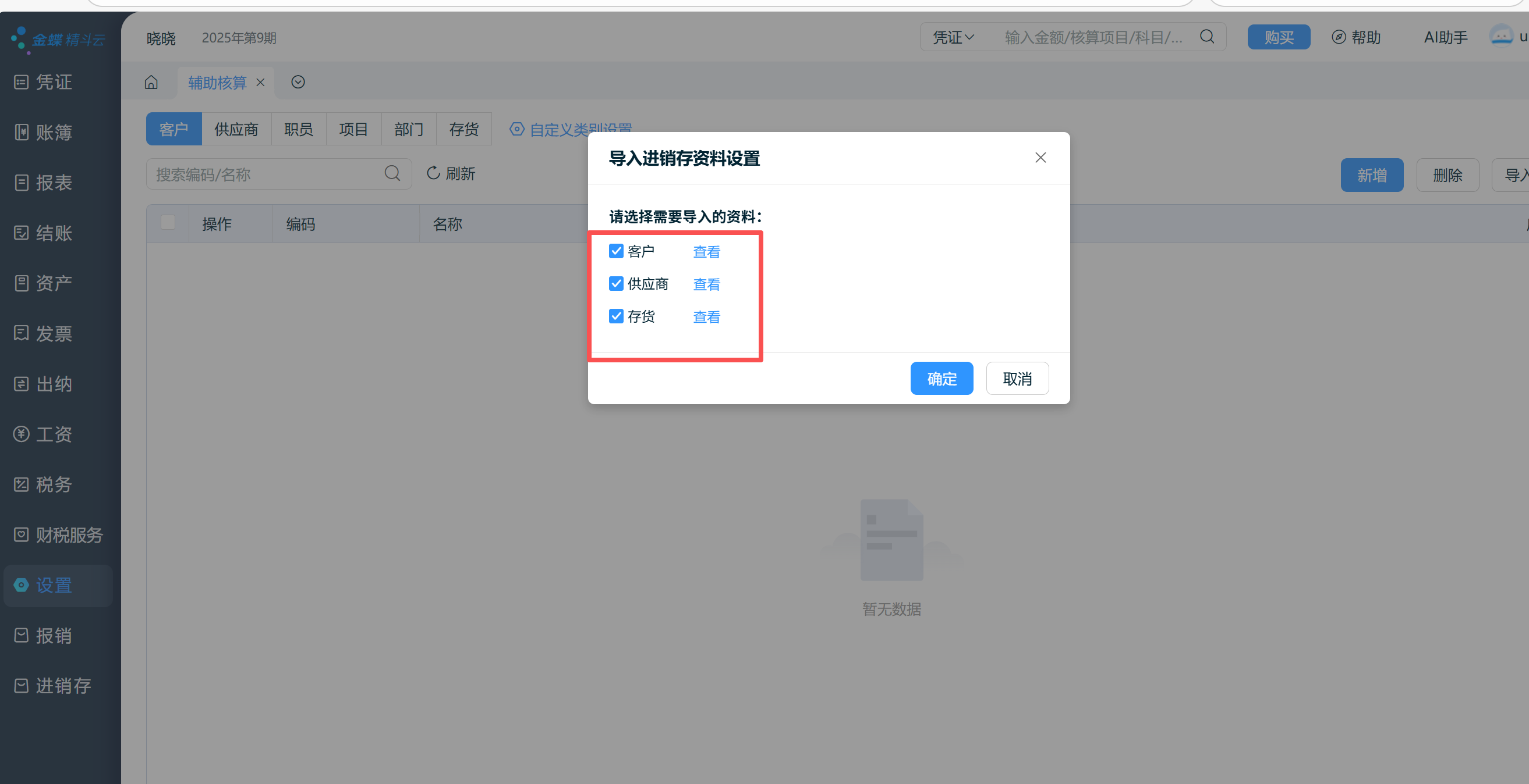 (3)勾选需要导入的基础资料类型后,点击“确认”上传。