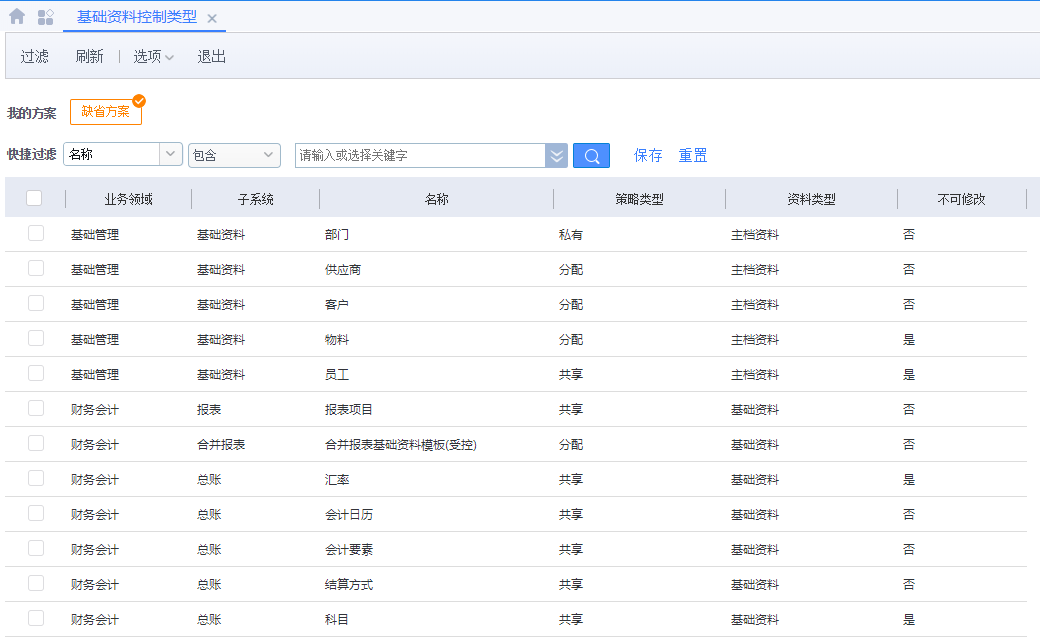 金蝶云星空在出厂时预置了基础资料的控制类型,具体如上。