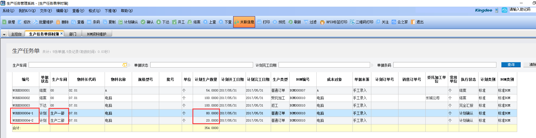 以2021年5月蓝海公司为例:原计划由生产一部生产100台电脑(生产任务单号 为WORK000004,对应BOM 编号为 BOM000010),因人员变动需调整为生产一部生产 80 台、生产二部生产 20 台,以下为具体分割操作步骤。