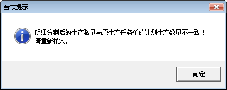 分割后生产数量的合计必须等于原生产任务单的生产数量。否则会出现如上图报错提示。