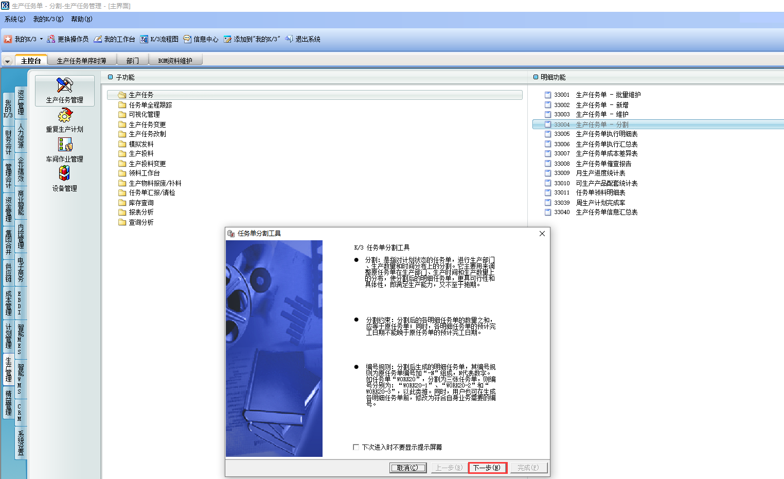 使用有权限的用户登录K/3主控台,依次点击【生产管理】→【生产任务管理】→【生产任务】,双击【生产任务单 - 分割】,即可进入任务单分割向导界面。