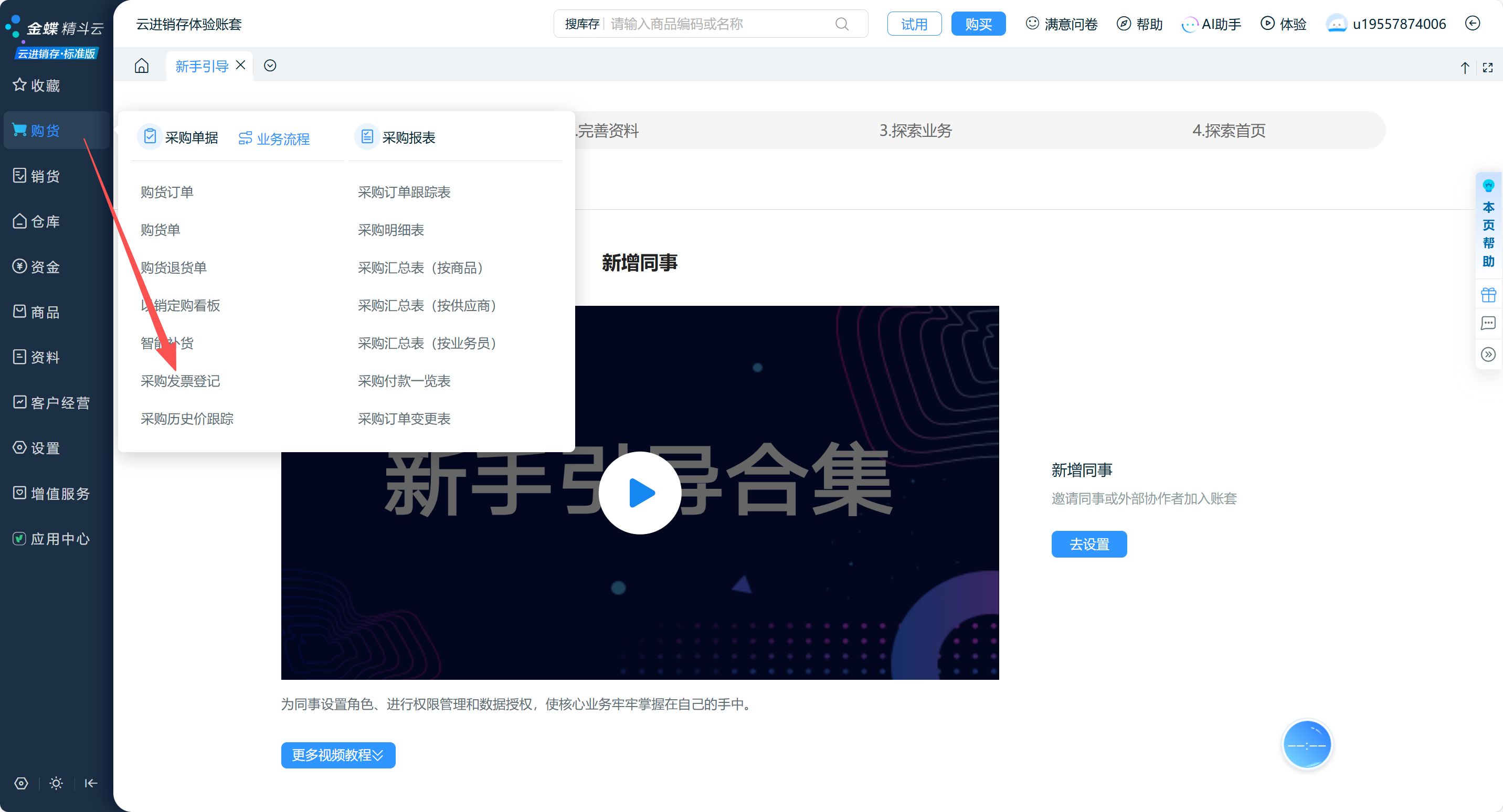 1、进入金蝶精斗云云进销存标准版,从左侧【购货】模块进入【采购发票登记】页面;