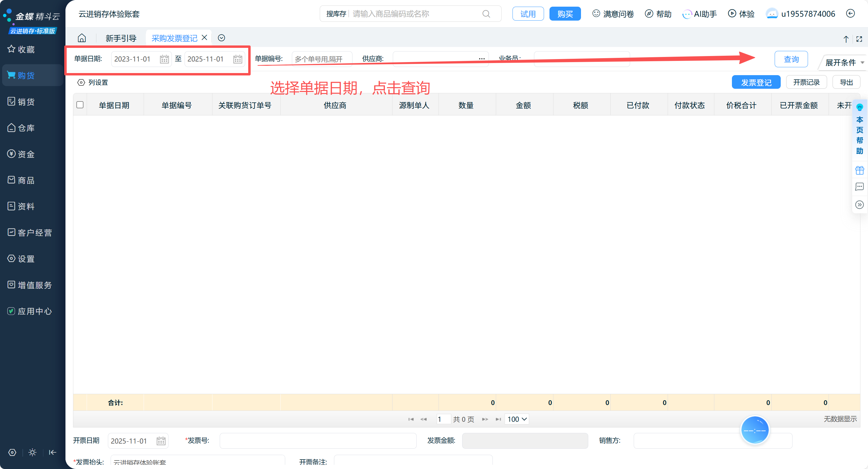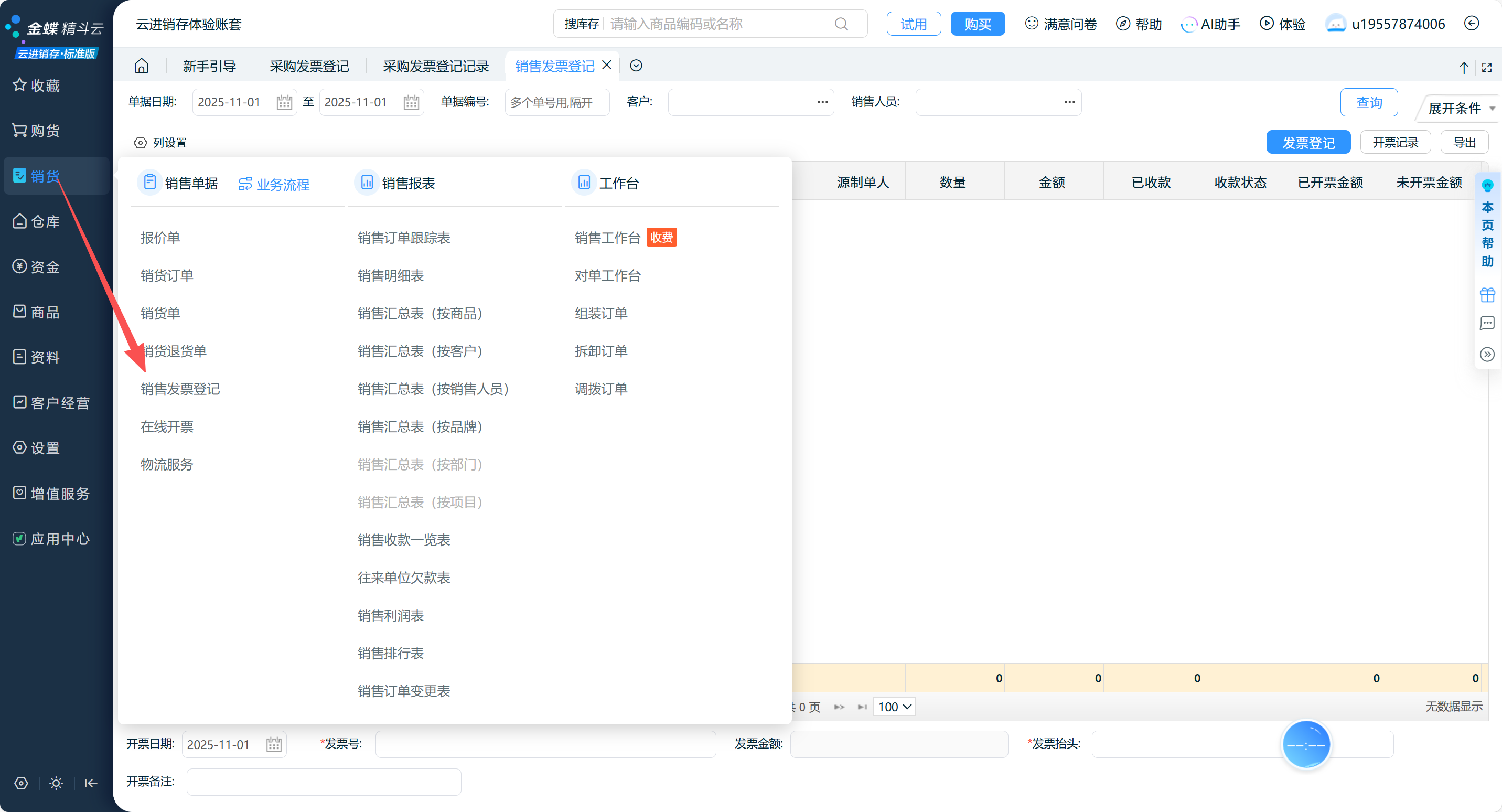 备注:销售开票记录操作同理,进入【销货】模块下的【销售发票登记】,重复上述查询、填信息、登记步骤即可。