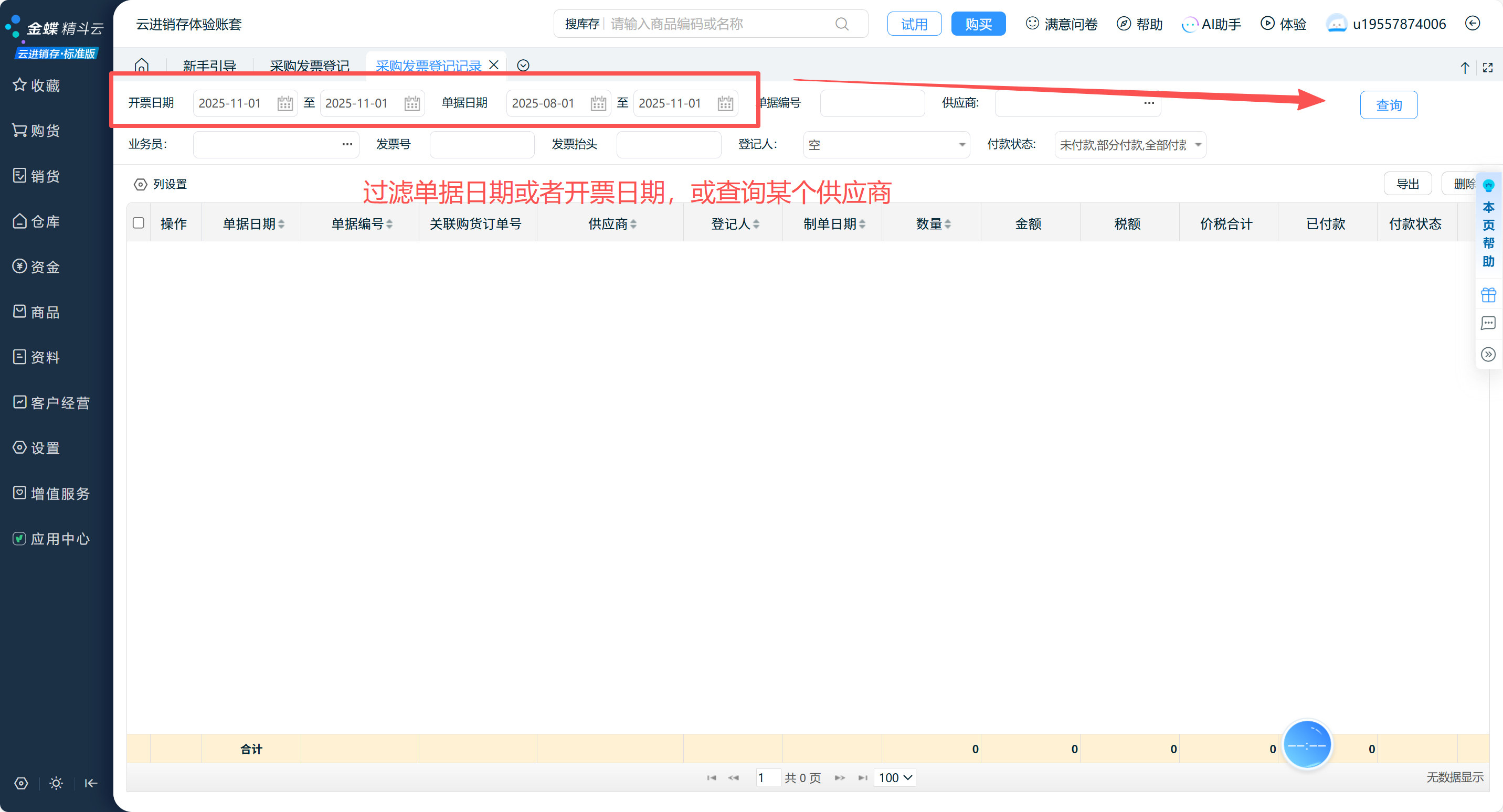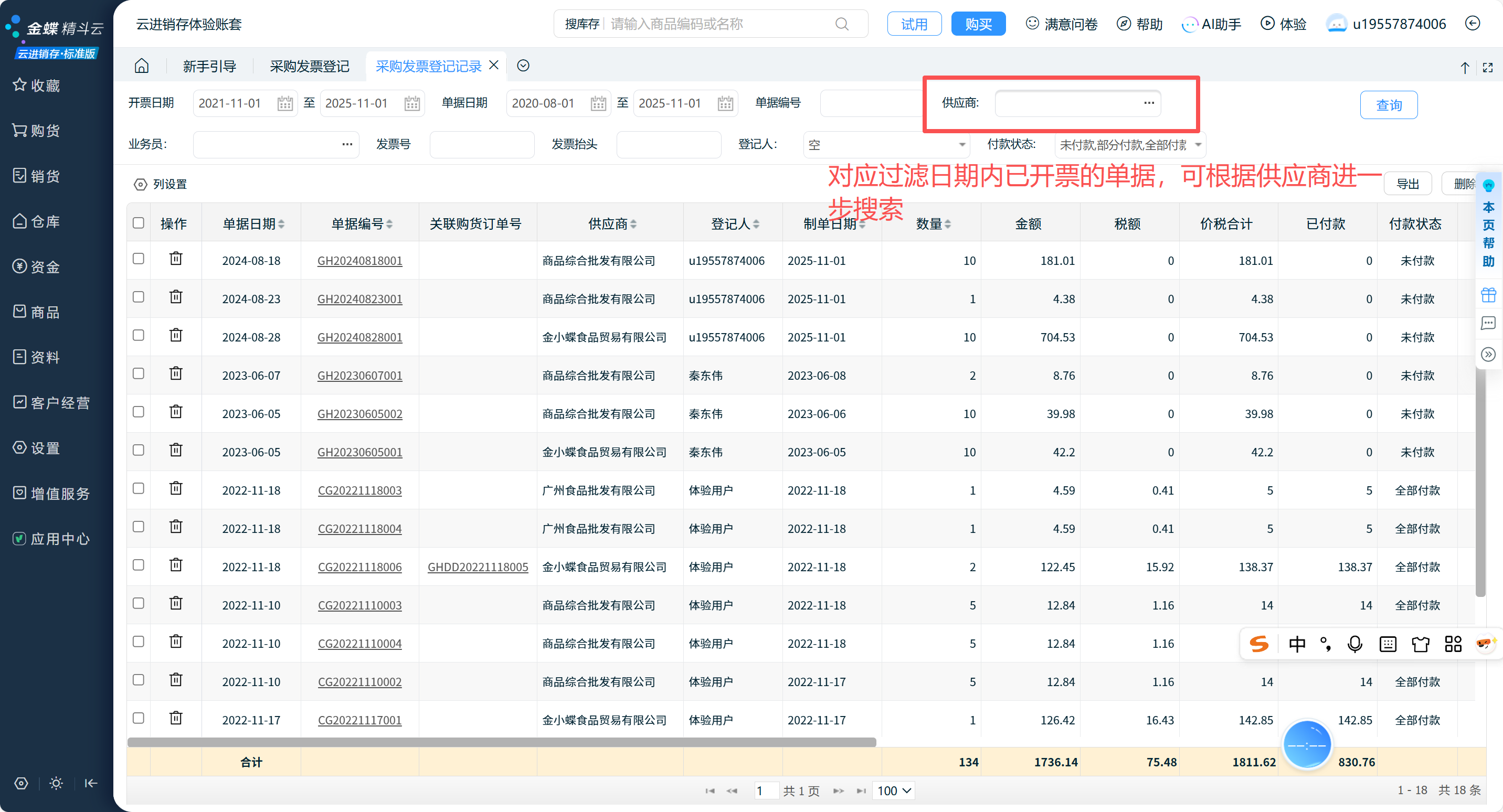 2、按日期、供应商/客户、发票号等条件筛选查询开票记录。