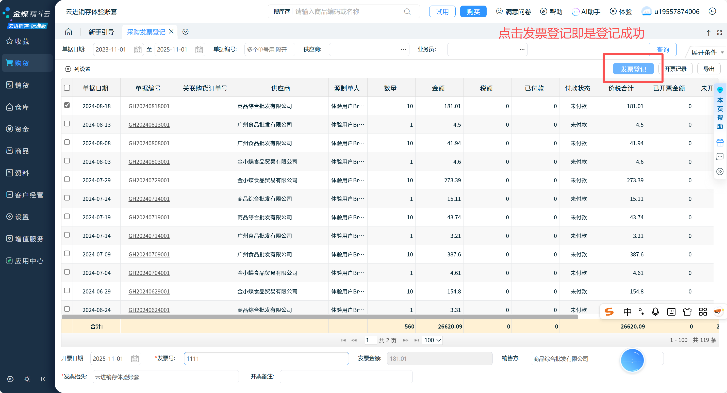 3、勾选已开票单据,填写发票号,点击“发票登记”即完成。