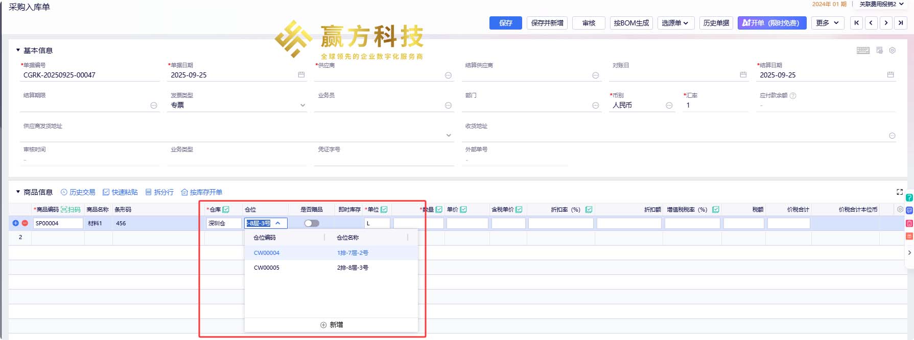在录入单据时,先选择仓库,后选择对应的仓位。