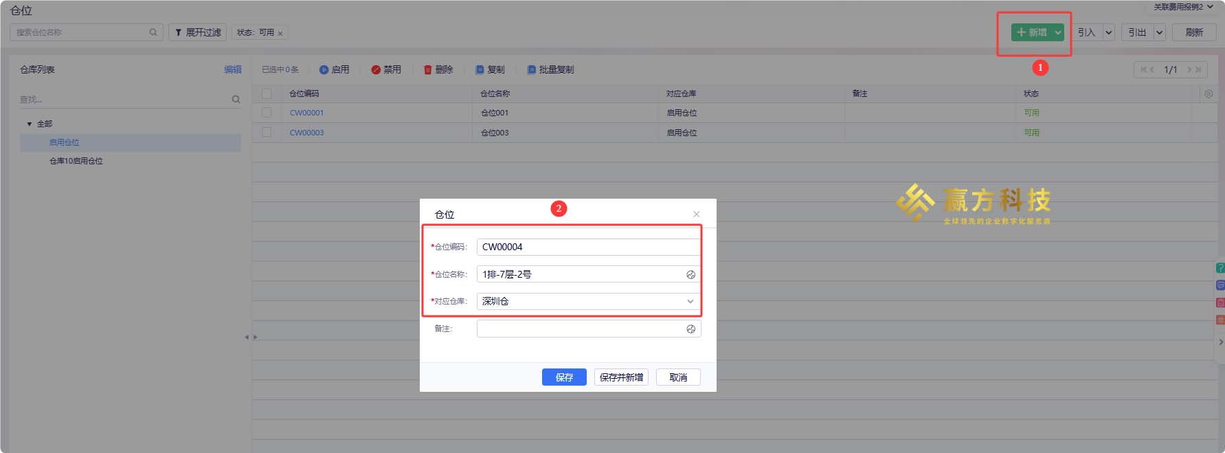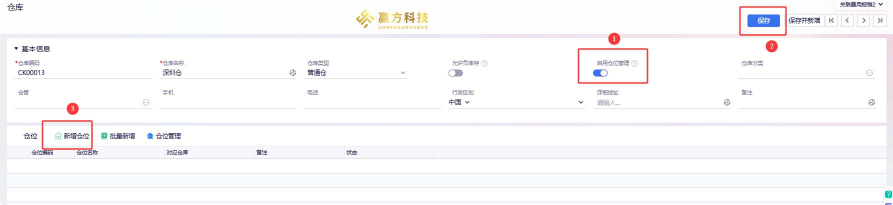 (2)选择目标仓库进入编辑界面,勾选 “启用仓位管理” 选项,点击 “保存”;再点击 “新增仓位”,可直接为创建该仓库的仓位。