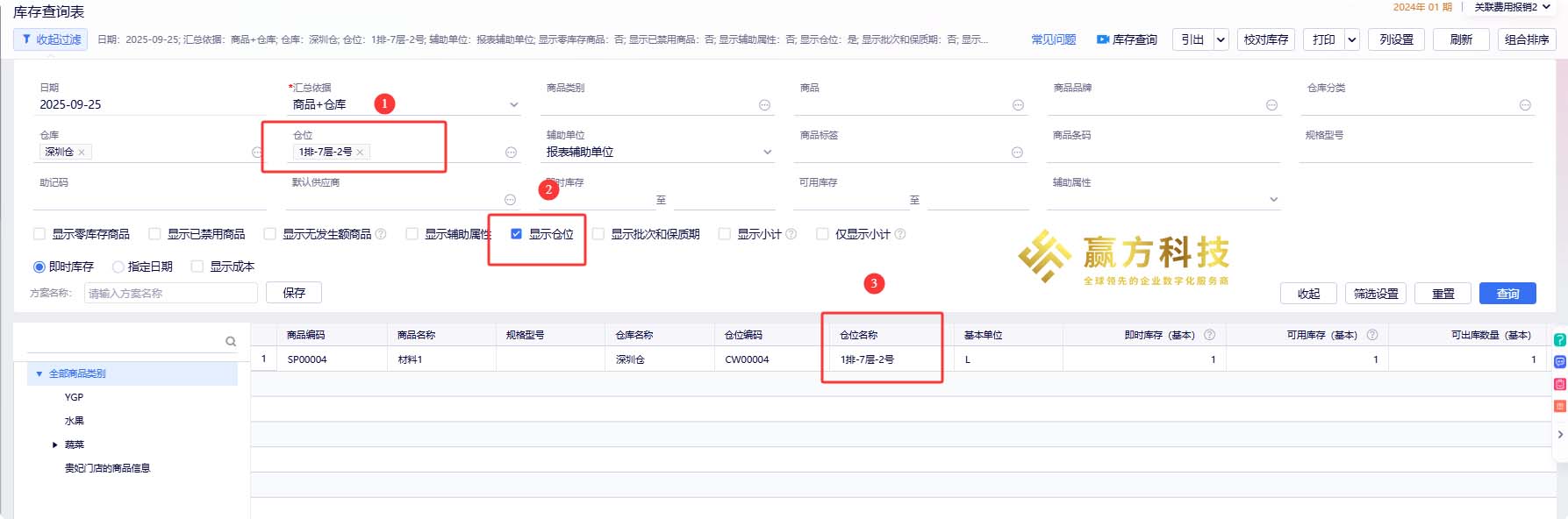依次点击【库存管理】-【库存查询表】,选择具体的仓位查询库存情况。