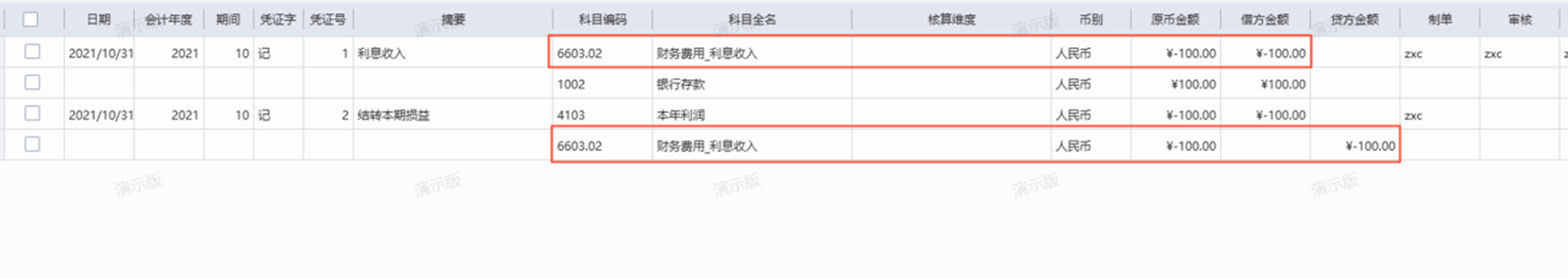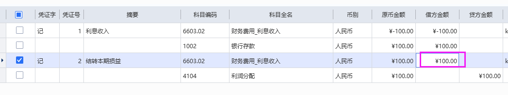(1)未勾选【按科目余额的相反方向结转】:结转损益的凭证是从贷方转出,则结转损益的凭证利息收入是贷方-100。