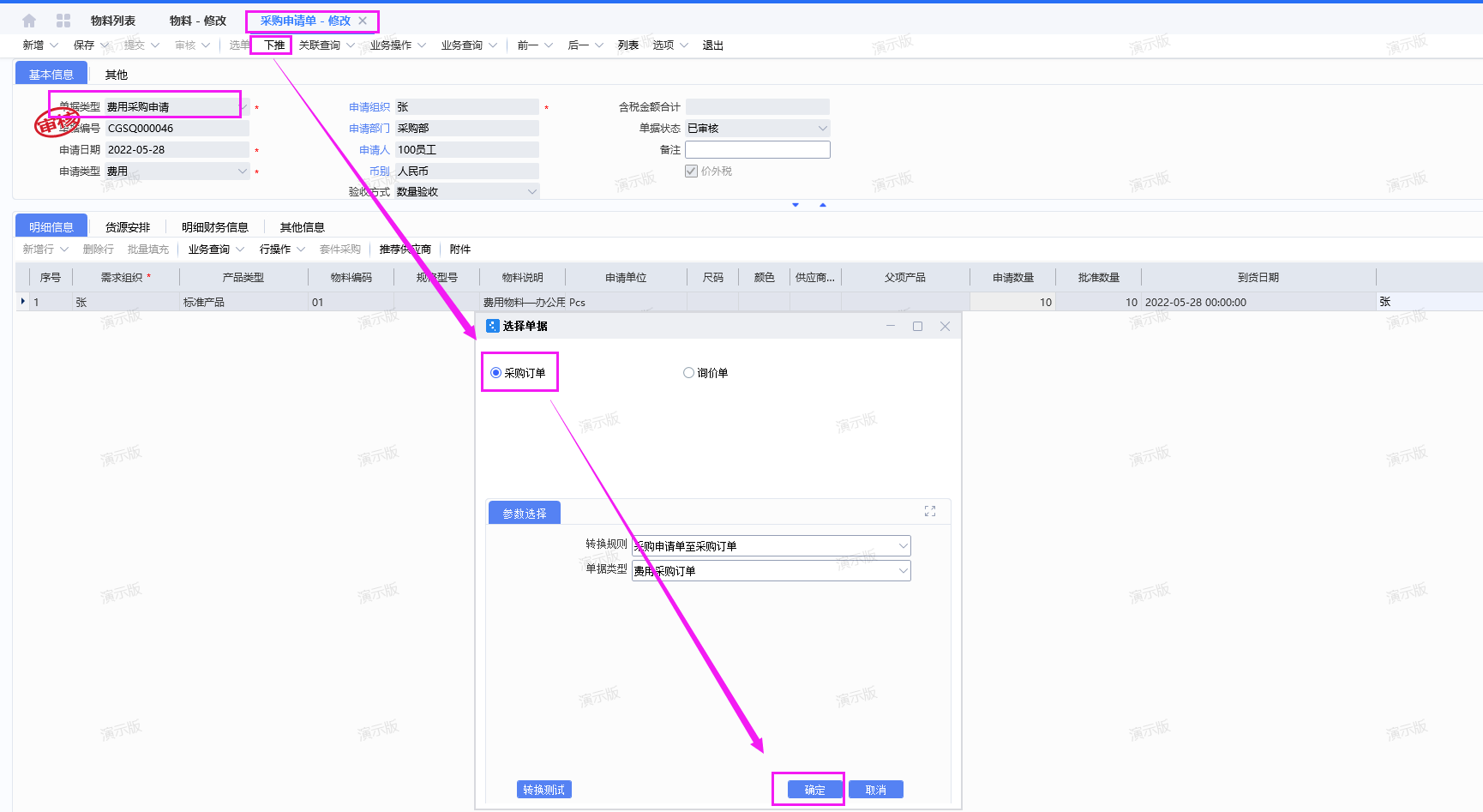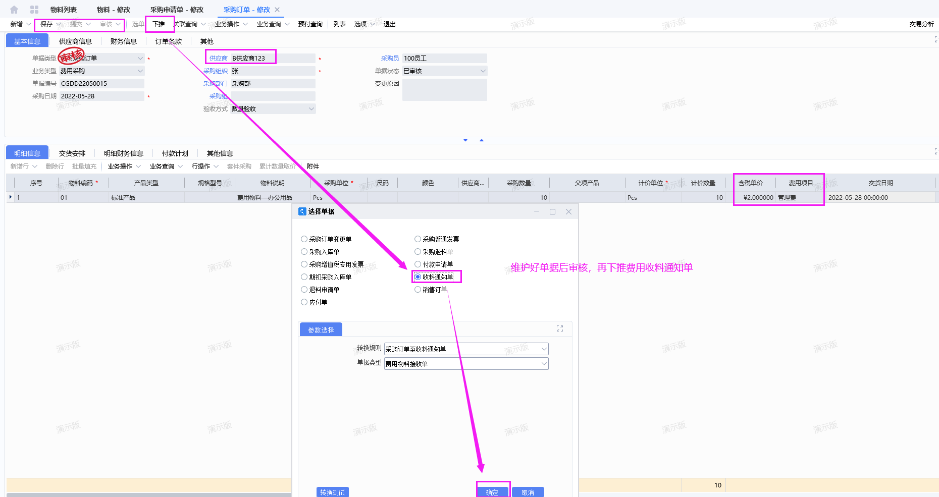 (1)可通过费用采购申请单下推生成费用采购订单,或直接新增订单并维护费用项目;