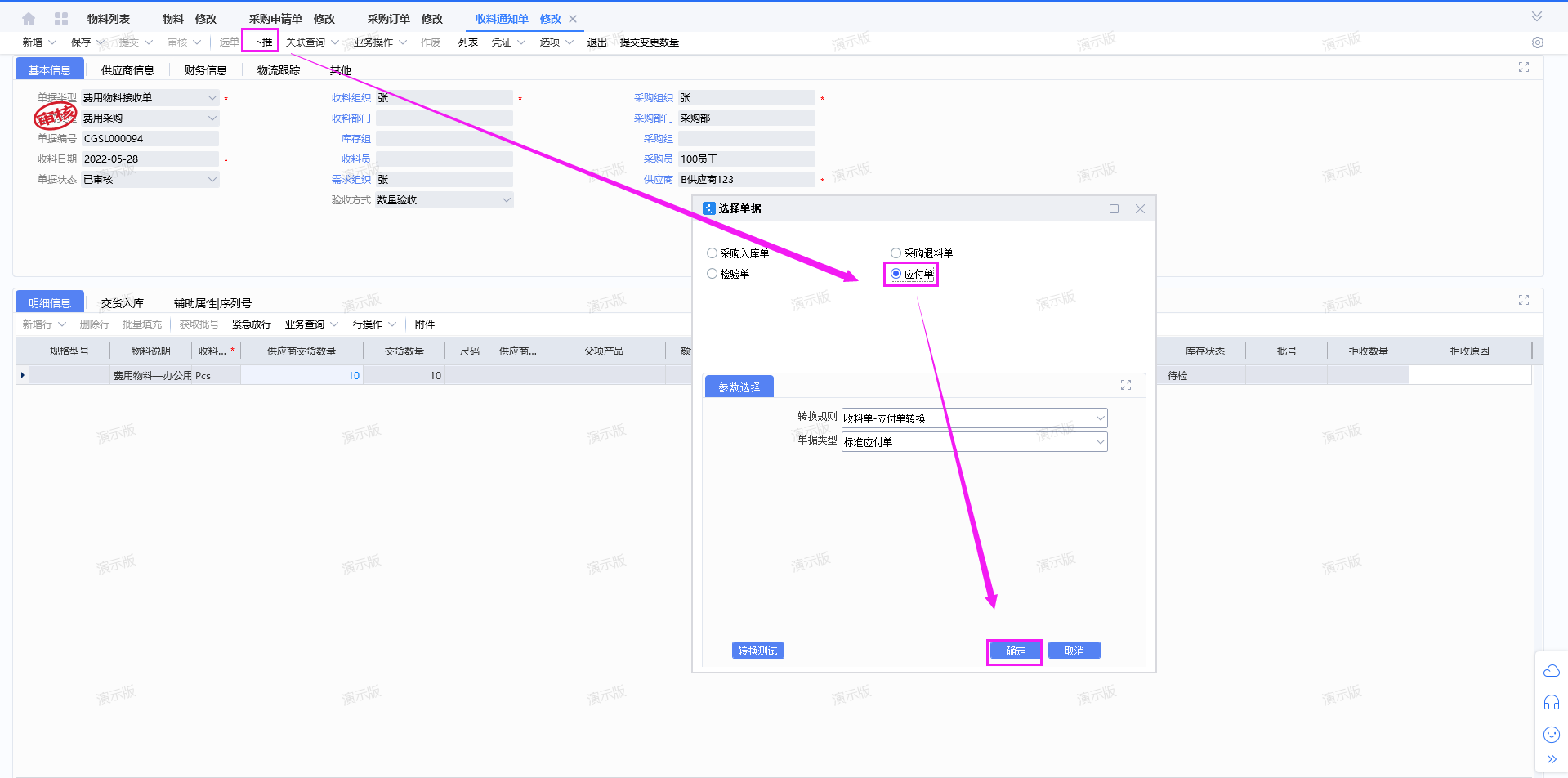 收料通知单审核并实际到票后,直接从该单据下推标准应付单即可。