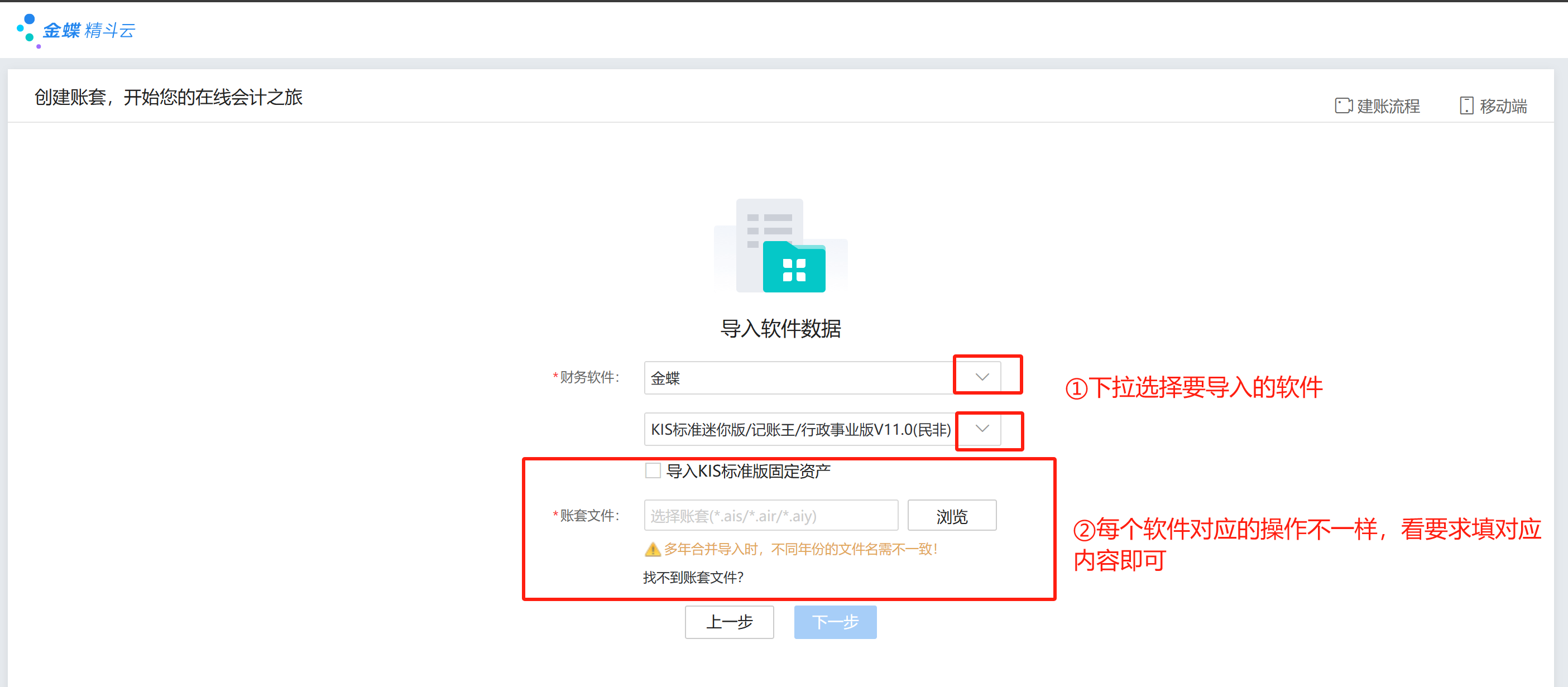 (2)精斗云云会计支持多种第三方软件导入:下拉 “财务软件” 选项,选定第三方软件及版本及上传合规格式文件;