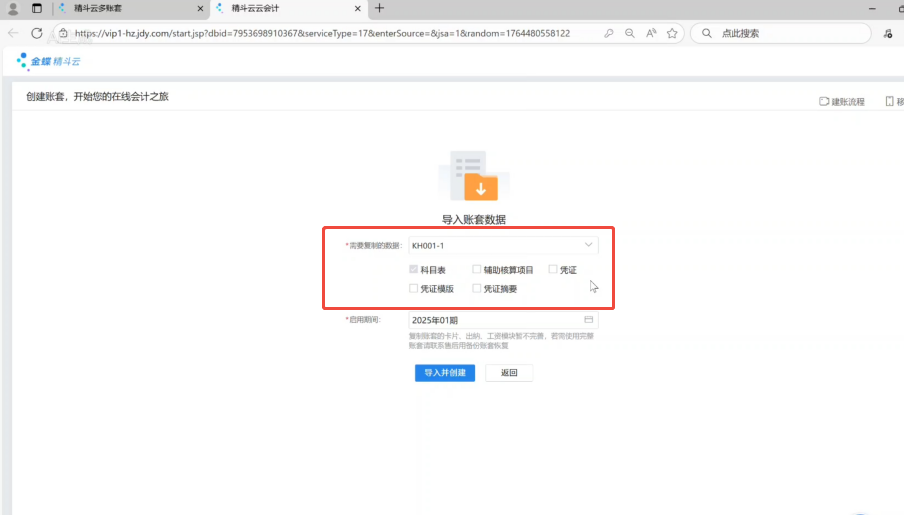 (2)选择同一平台下的目标账套,勾选需导入的具体数据后,点击“导入并创建”。