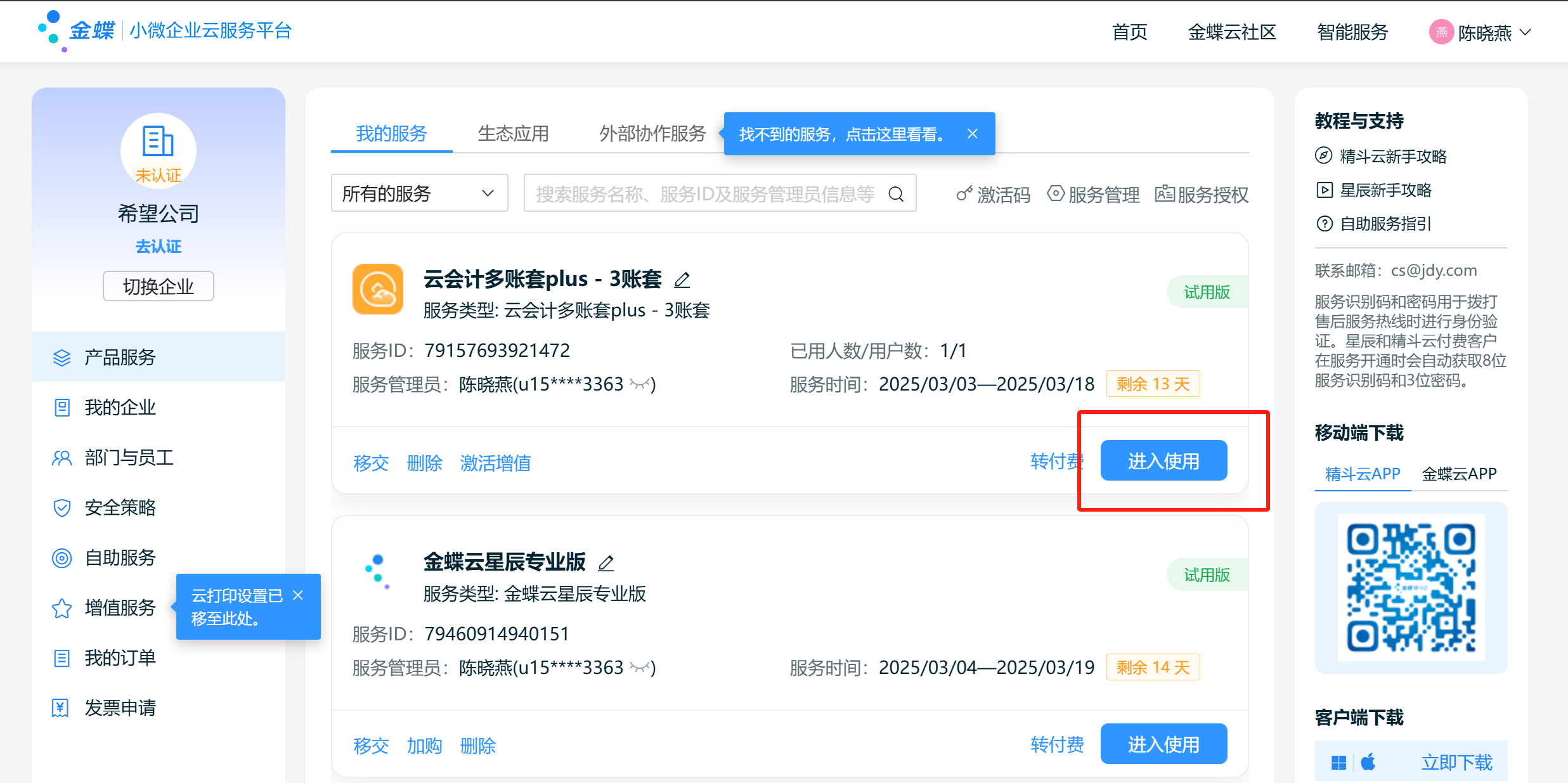 登录金蝶精斗平台,找到云会计账套,点击“进入使用”。