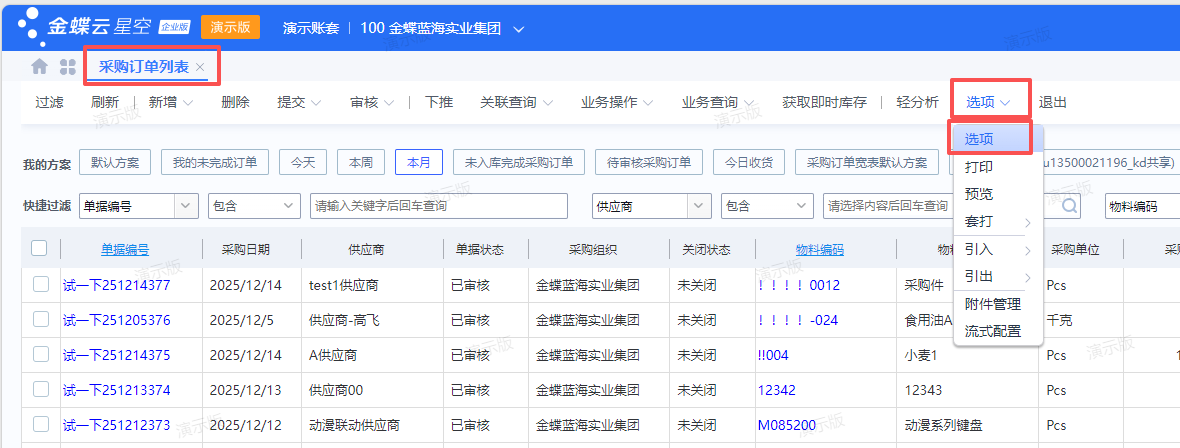 进入金蝶AI星空采购列表页面,找到顶部功能栏中的【选项】按钮,点击进入设置界面