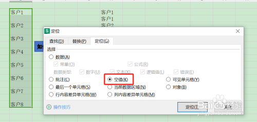 (2)同时按下快捷键【Ctrl+G】,调出定位对话框,勾选【空值】选项后,点击【定位】按钮。