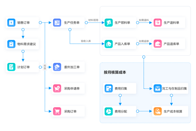 提供从订单到生产的全流程管理,物料需求快速计算,生产进度清晰掌控,生产成本精准核算,助力小型工贸企业打造产供销与业财一体化管理,实现降本增效的经营目标。