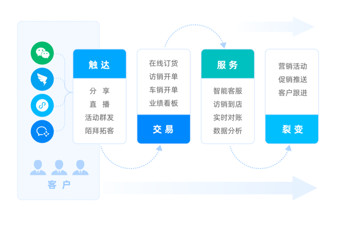 围绕“触达-交易-服务-裂变”的客户经营链路,在每个节点帮助企业构建客户经营的数智化服务能力,打造“极致交易体验”+“数字化管理”,帮助企业实现业务的线上化和数据的可视化,提升企业经营业绩。