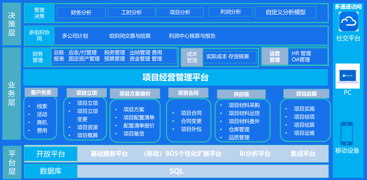 数字化战略指引下搭建以项目为中心的产业互联平台成为云天励飞破局的关键。我们结合数字化战略,给云天励飞制定了数字化应用架构。同时基于数字化应用架构,以项目为中心打造端到端流程闭环应用。通过不断完善数字化蓝图,最终实现云天励飞的数字项目管理,提升敏捷协同效率,实现智慧化运营。金蝶云星空为云天励飞数字化转型提供以项目为中心的集团一体化管控蓝图。