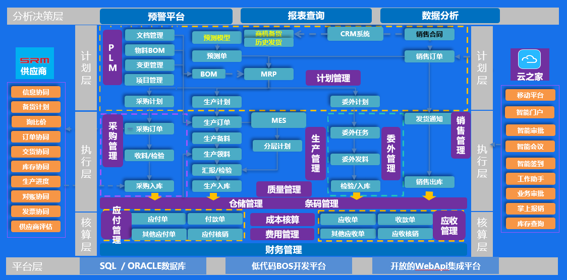 链接上下游,抱团取暖合作共赢:与供应商实现询报价、订单、发货、入库、对账协同;实现查看供应商备货进度、供应商库存;打通供应链上下游企业关系,与供应商紧密合作,互信互利,提升供应效率。