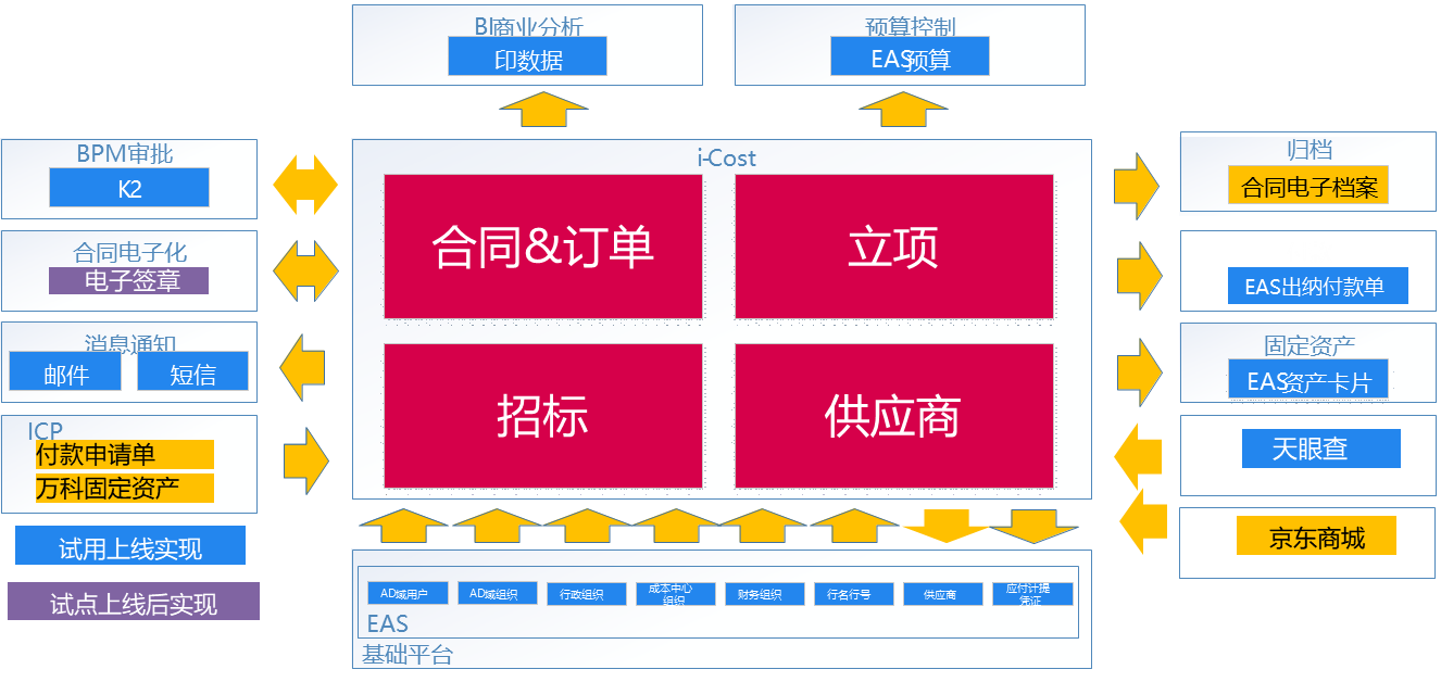 针对目前印力集团IT系统较多、采购业务支撑系统缺失的情况,金蝶苍穹技术平台的集成云解决方案,集成业务、财务、审批、电子签单、天眼查、商城、IDM、K2等系统,合同、订单款项业务和金蝶EAS财务、预算系统无缝集成,帮助印力实现业财税一体化,实现业务流、财务流、信息流三流⼀体,避免形成信息孤岛。