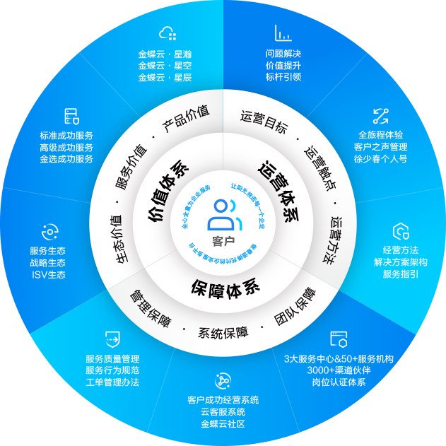 系统保障:通过六大系统支撑,为客户提供技术支持、客户成功经营和基础运维管理,帮助企业解决真问题,全面提升客户体验与服务创新