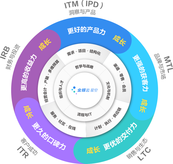 五力成长飞轮模型是金蝶云·星空集合3万余家企业实践,沉淀出的成长型企业数字化转型实践方法论,能够帮助企业,通过数字化变革提升产品力、获客力、交付力、口碑力、收益力等核心领域能力,五力端到端首尾相连,相互促进,快速滚动,形成飞轮效应,帮助构建数字战斗力,实现韧性成长