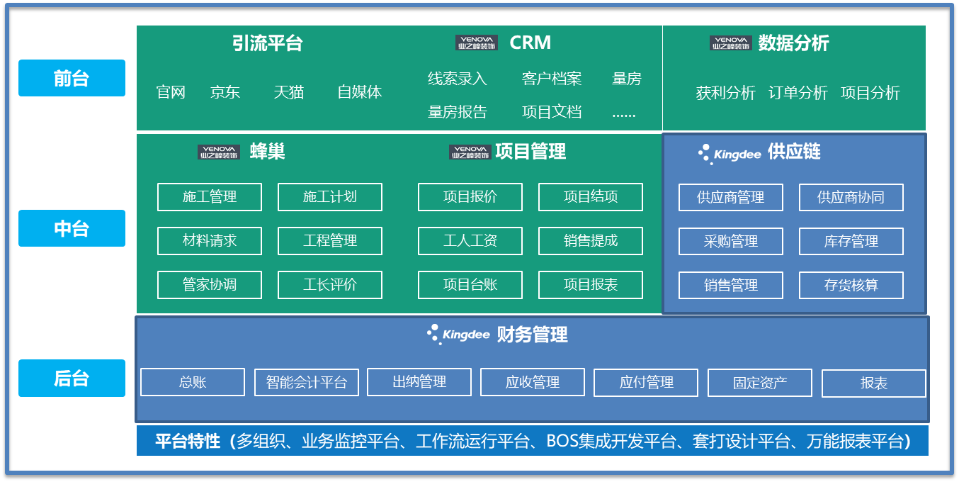 业之峰的整体信息化强调松耦合。业之峰是多组织企业,倾向通过系统的弹性化结构来适应来适应业务的变化和发展。金蝶云·星空以财务供应链为主数据平台,连接引流平台(获客)、服务系统(CRM)、施工系统(峰巢)交付管理系统、大数据应用平台,将相关业务整合在同一个系统平台,打通需求、设计、供、销、服、财、一体化价值链。也可满足其“任一系统单独拆出来都可以独立运行,任两三个系统结合起来都是可以对接”的需求。