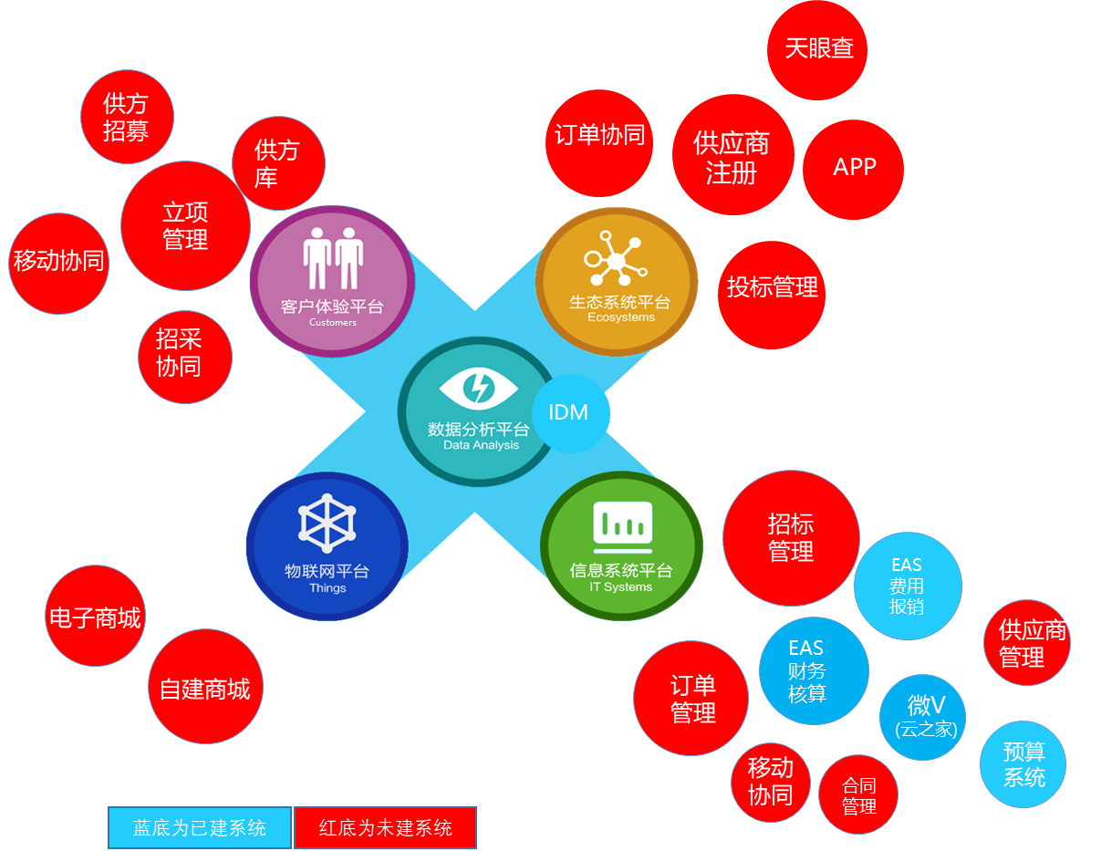 由上面EBC全景扫描示意图可知,除了主数据IDM、财务基础核算、费用报销和协同系统已经建设完毕,在采购支出管理业务中,大部分采购业务需要一个平台支撑印力集团的采购数字化转型服务。